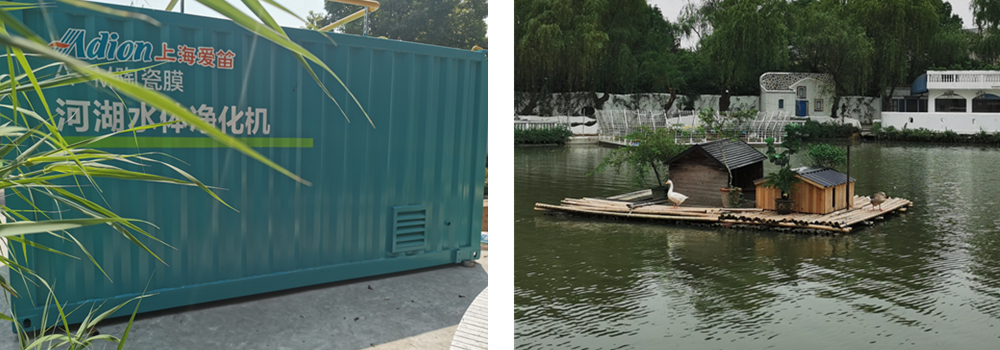 上海愛(ài)笛環(huán)境公司結(jié)合該景觀湖水質(zhì)的具體情況,制訂了針對(duì)性的水質(zhì)提升解決方案,采用愛(ài)笛的“A-M 陶瓷膜河湖水體凈化機(jī)+復(fù)合生態(tài)浮島”工藝,同時(shí)適當(dāng)啟動(dòng)原有的“人工瀑布+曝氣增氧機(jī)”,具有投資省、占地小、對(duì)周邊環(huán)境影響小、施工維護(hù)簡(jiǎn)便、運(yùn)行成本低、無(wú)二次污染等特點(diǎn)。通過(guò)修復(fù)水體生態(tài),激活水體的自凈能力,并美化水體景觀,取得良好的治理效果。