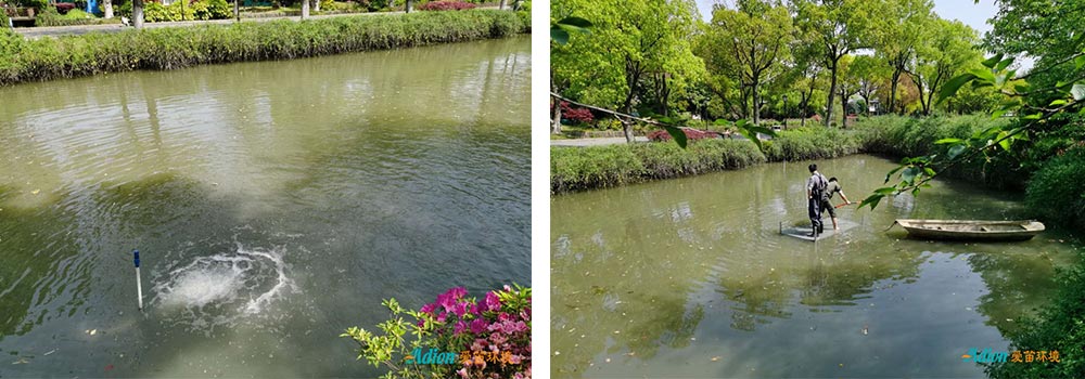??A-N型微納米曝氣機??1臺,給水體增氧。設置潛水推流機2臺,提高水體的流動性。并種植沉水植物及睡蓮、荷花等。通過修復水體生態(tài),激活水體的自凈能力,并美化水體景觀,取得良好的治理效果。投資省、占地小、對周邊環(huán)境影響小、施工維護簡便、運行成本低、無二次污染。