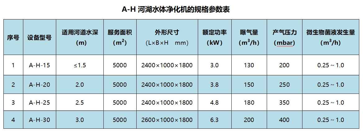 1. 主體設(shè)備—— A-H河湖水體凈化機(jī):集“微納米增氧”與“土著微生物激活”功能于一體,提升水體溶解氧,改善水動(dòng)力,并激活水體中的本土微生物,原位修復(fù)微生態(tài),提高水體自凈能力