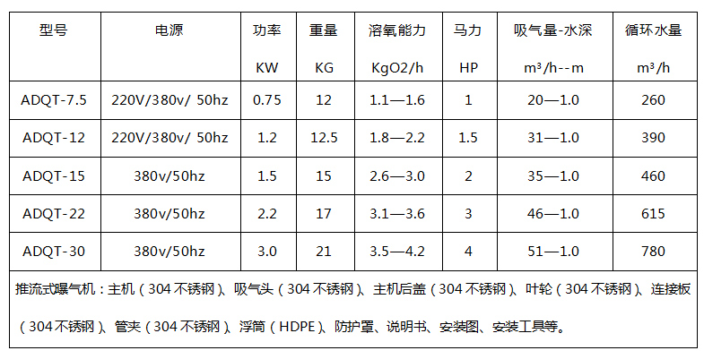 ADQT型潛水式推流曝氣機(jī)是專門針對(duì)江河湖泊等水體凈化改善水質(zhì)而研制開發(fā)設(shè)計(jì)的增氧、造流、循環(huán)、凈化水質(zhì)的高效節(jié)能的水處理設(shè)備。推流曝氣機(jī)是由專用高速電動(dòng)機(jī)、吸氣室、進(jìn)氣管、葉輪等部件組成。高性能電動(dòng)機(jī)帶動(dòng)葉輪高速旋轉(zhuǎn),使吸氣室產(chǎn)生真空低壓區(qū),空氣在大氣壓力的作用下,經(jīng)進(jìn)氣管吸入的壓縮空氣與水體充分混合,最后通過葉輪高速旋轉(zhuǎn)產(chǎn)生強(qiáng)大的軸向推動(dòng)力和徑向攪拌力,將吸入的空氣攪碎成很細(xì)小的氣泡,并向水平方向推射入水體。對(duì)水體沖擊、攪拌、推動(dòng)水流,加速氣泡擴(kuò)散混合到水體中,使空氣中的氧充分被溶解和吸收,提高了氧轉(zhuǎn)移效率,達(dá)到曝氣充氧的目的。
