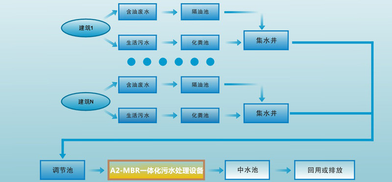 工藝流程由于本公司的A-MBR系列設(shè)備的占地小、出水水質(zhì)好、運(yùn)行維護(hù)簡(jiǎn)便等特點(diǎn),與風(fēng)景區(qū)污水處理項(xiàng)目的需求非常吻合,已得以廣泛應(yīng)用??筛鶕?jù)用戶的水量大小和現(xiàn)場(chǎng)情況,在A1、A2或A3三大系列中選用合適的規(guī)格。工藝流程如下(以分片收集處理為例):