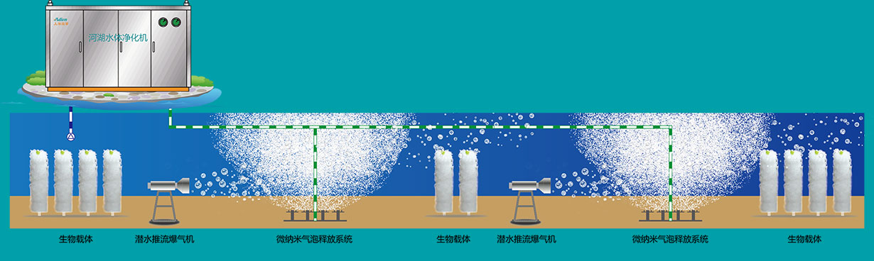 使用產(chǎn)品:A-H河湖水體凈化機(jī),ADQT潛水推流曝氣機(jī),ADWZ微生物載體